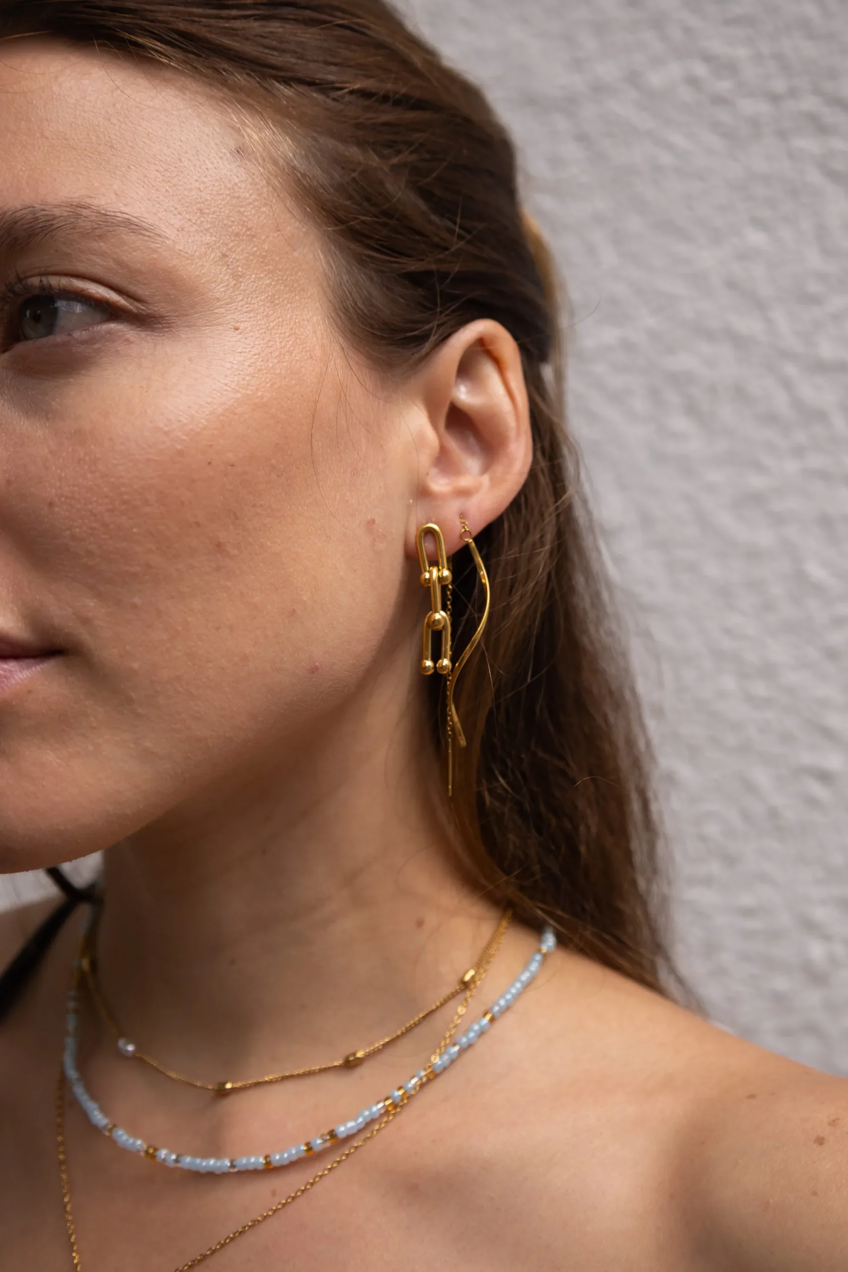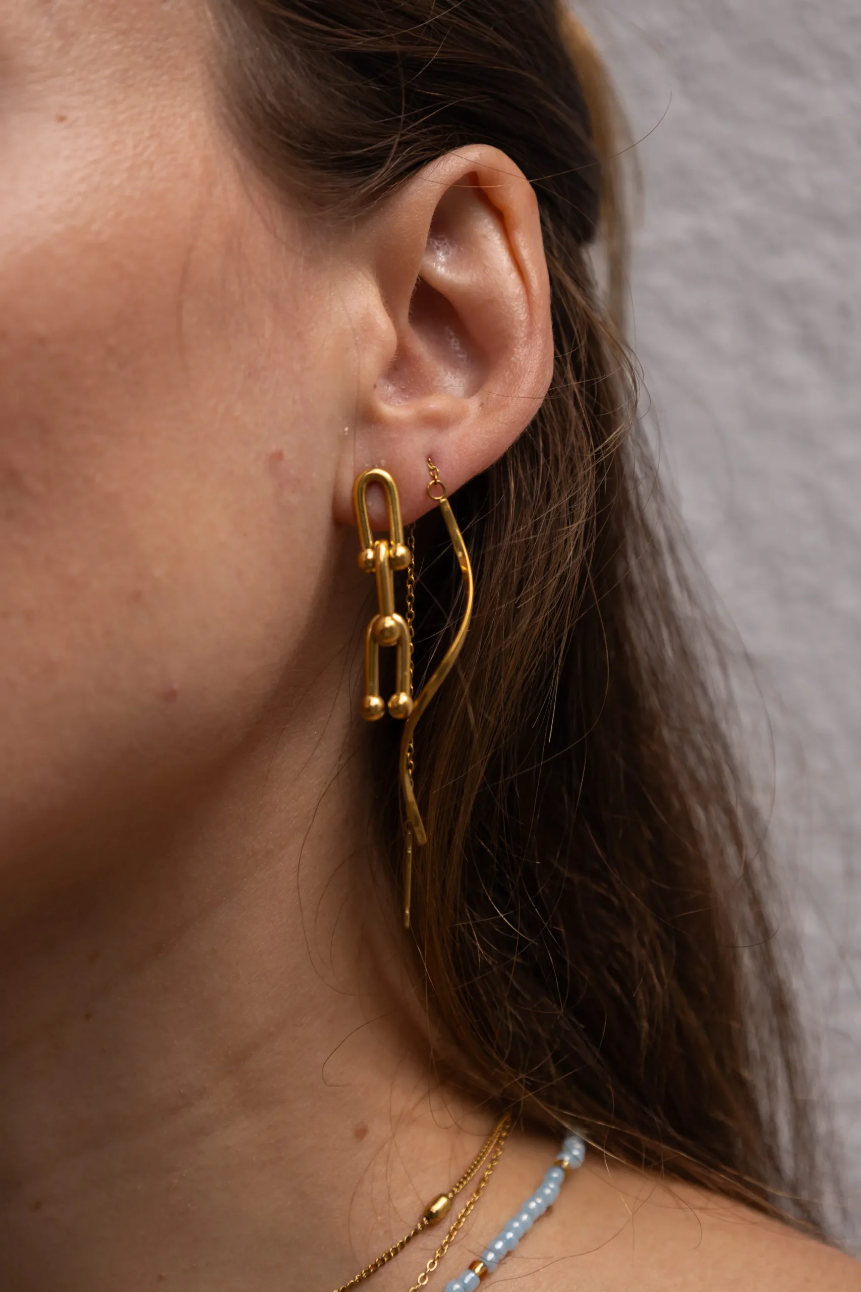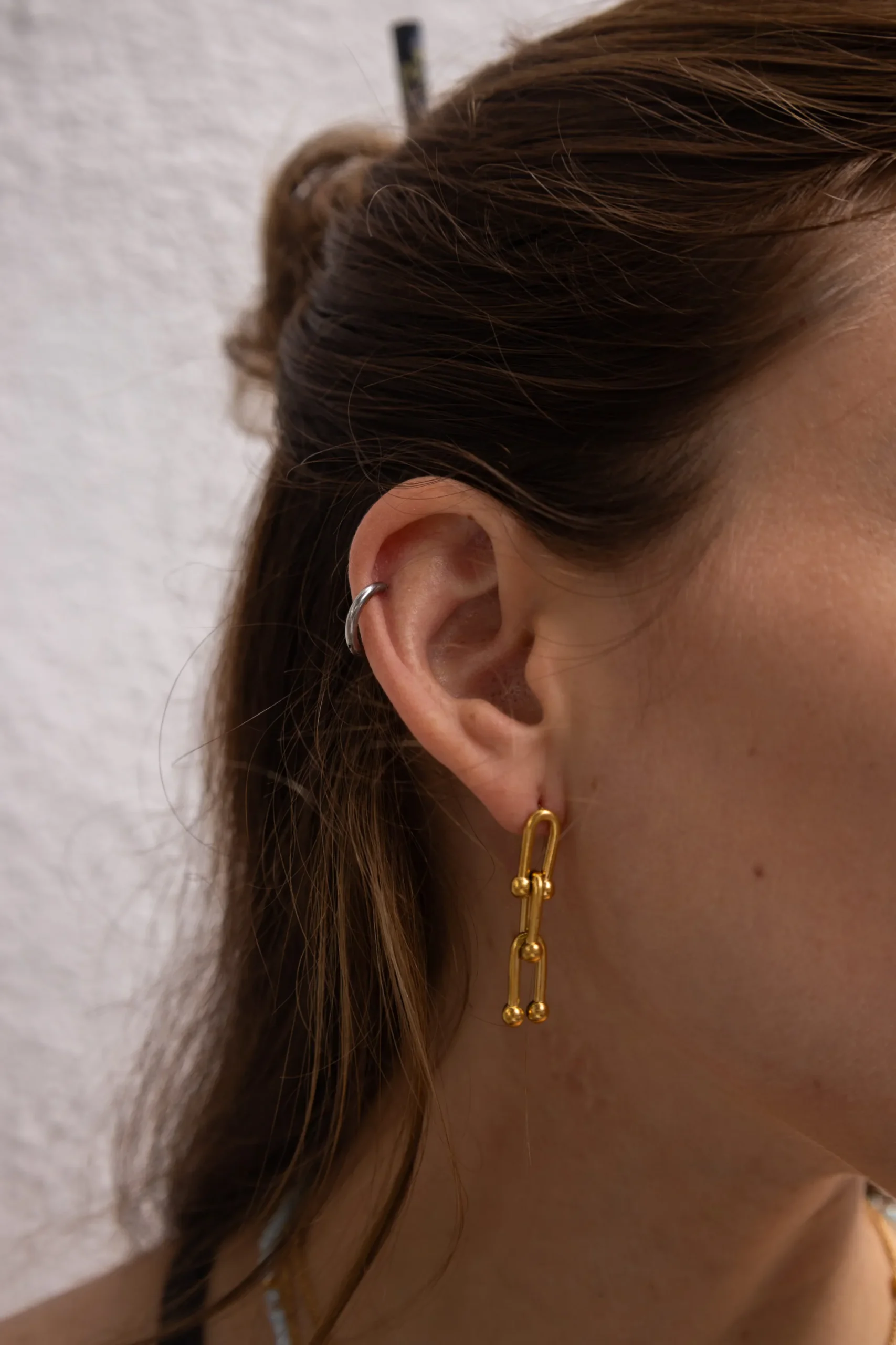 El Aro Eslabón Doble de Inaceli es una pieza distintiva que destaca por su estructura de eslabón doble. Se adapta suavemente al contorno del oído, ofreciendo una notable presencia cuando se lleva puesto. Acero Inoxidable enchapado en Oro PVD.