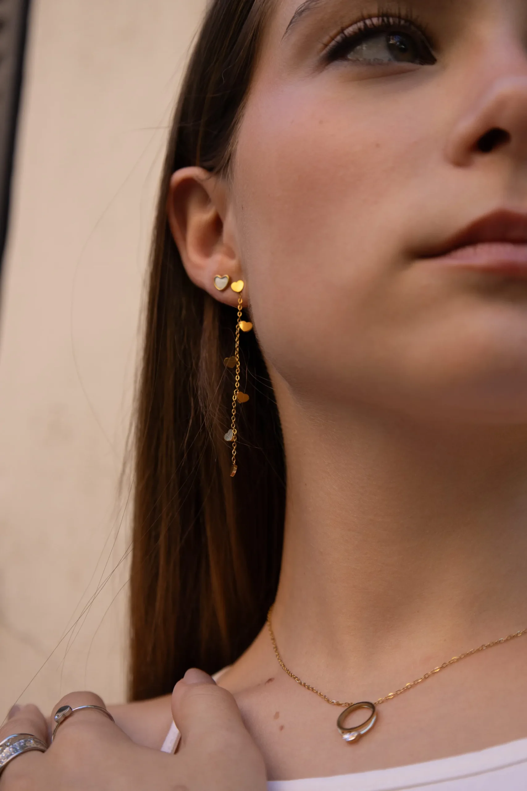 El Aro Corazones Colgantes de Inaceli presenta una estructura delicada, donde los corazones suspendidos añaden un movimiento encantador. Se adaptan con gracia a cualquier estilo, destacando en cada ocasión. Acero Inoxidable enchapado en Oro PVD.