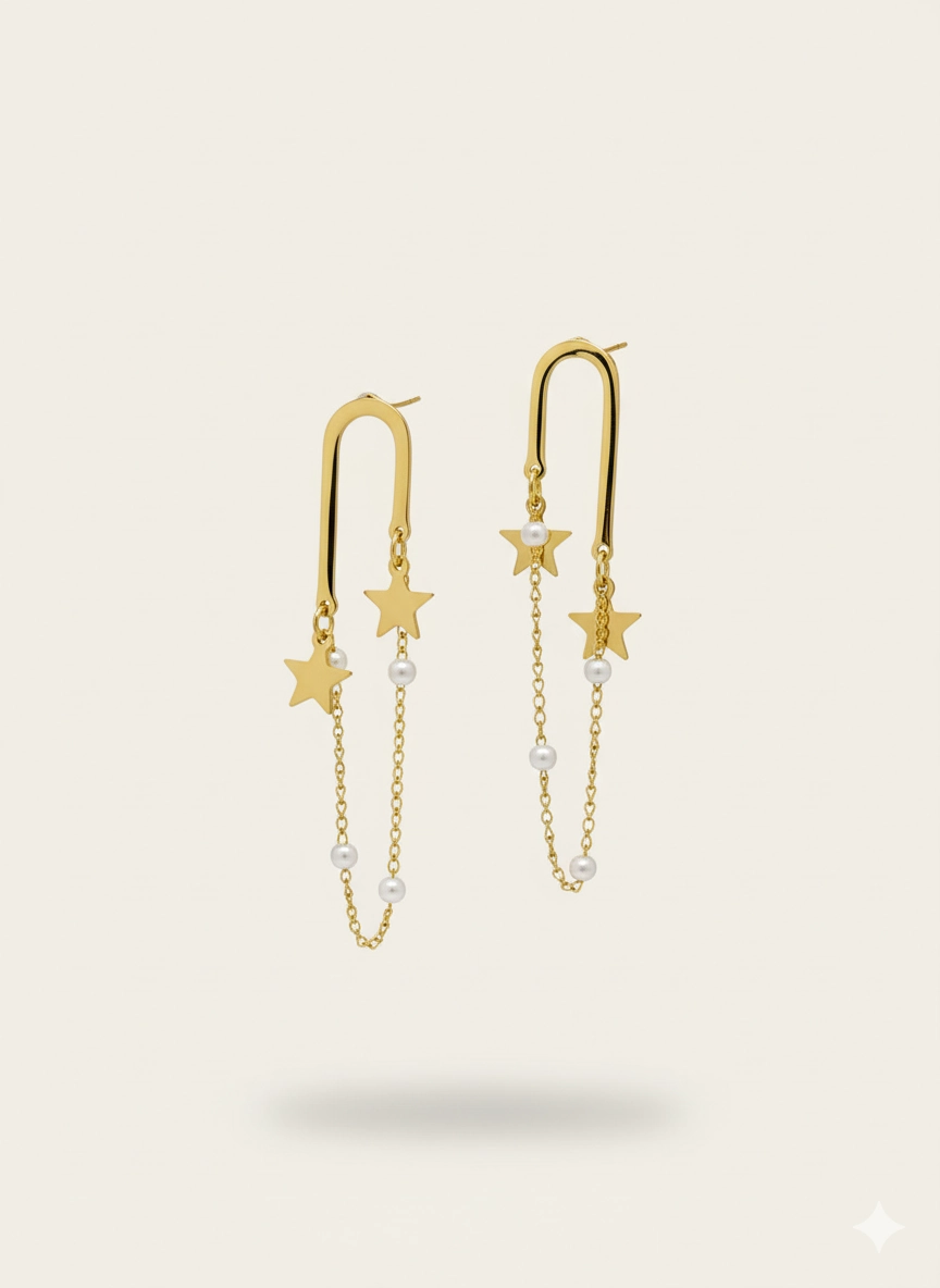 Aros enchapados en oro PVD , con un diseño lleno de estilo y dulzura , con perlas y estrellas que cuelgan suavemente, ideales para ocasiones especiales.