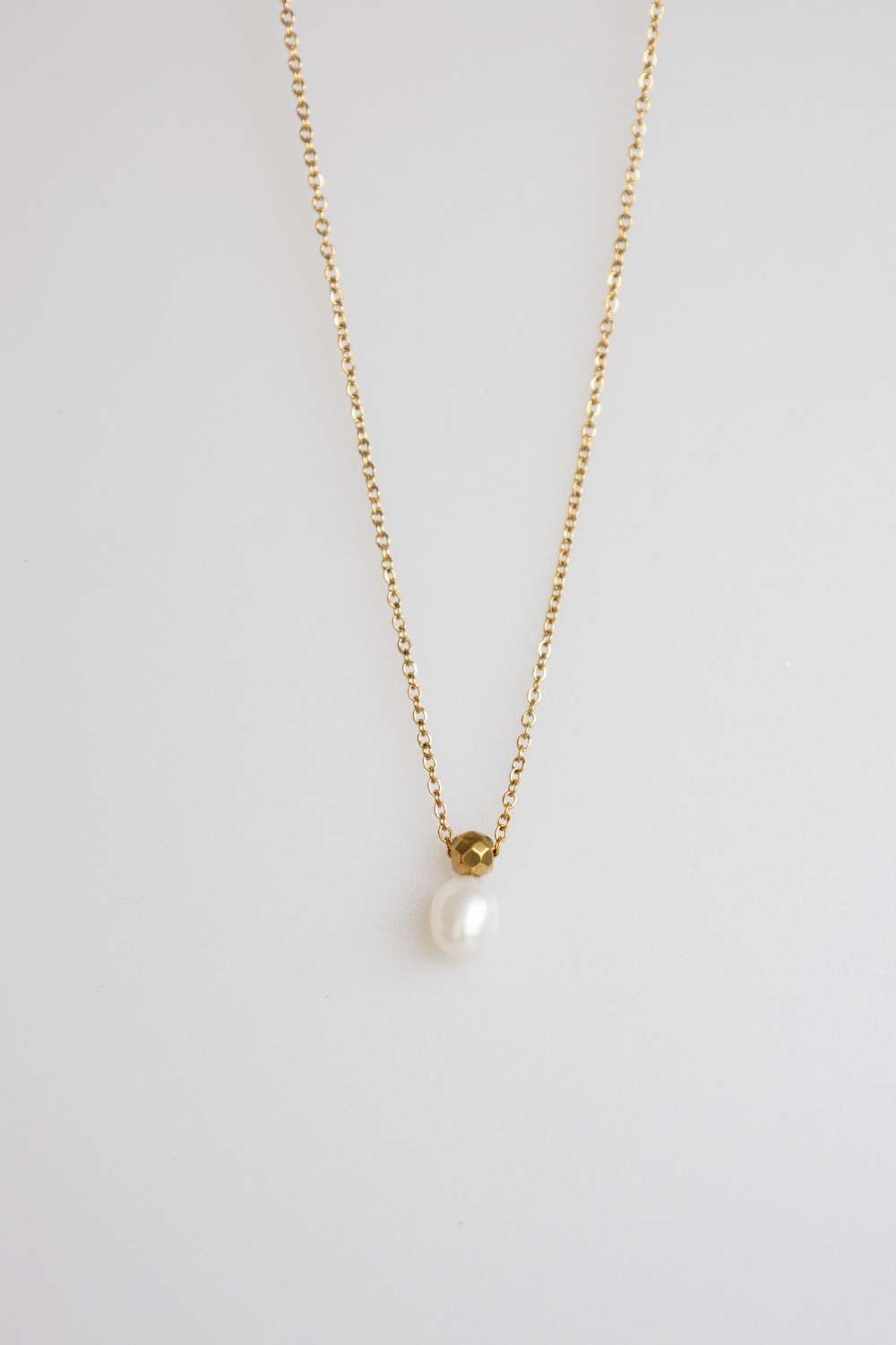 Nuestro Collar Perla Dorada Minimal combina la delicadeza de una perla con el brillo cálido del dorado, creando un diseño equilibrado y sofisticado. La pequeña esfera facetada en tono oro aporta un detalle moderno que realza la suavidad natural de la perla colgante.
